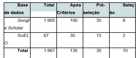 No total, foram identificados 1.967 artigos nas bases de dados consultadas, sendo 1.900 do Google Scholar e 67 do SciELO. Após a aplicação dos critérios de inclusão e exclusão, permaneceram 130 estudos (100 do Google Scholar e 30 do SciELO), dos quais 50 foram pré-selecionados com base na leitura dos títulos e resumos (35 do Google Scholar e 15 do SciELO). Ao final, 10 artigos foram selecionados para leitura na íntegra por apresentarem maior relevância ao tema proposto, sendo 8 provenientes do Google Scholar e 2 do SciELO.