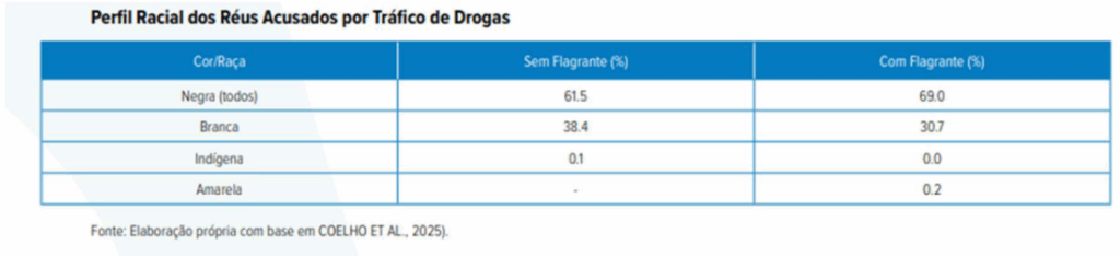 Dados de uma tabela do Atlas da Violência (2025) indicam que, no tráfico de drogas – um crime que autoriza busca pessoal em flagrante -, 69% dos presos em flagrante são negros. Esse achado destaca a significativa presença de pessoas negras entre os detidos, o que sugere uma seletividade nas buscas pessoais.
