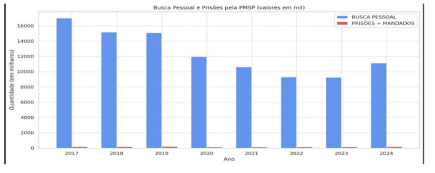 Em 2023, a Polícia Militar do Estado de São Paulo realizou 9.248.045 (nove milhões, duzentos e quarenta e oito mil e quarenta e cinco) revistas pessoais, resultando em 162.796 (cento e sessenta e dois mil, setecentos e noventa e seis) prisões. Isso representa uma taxa de efetividade de 1,76%.