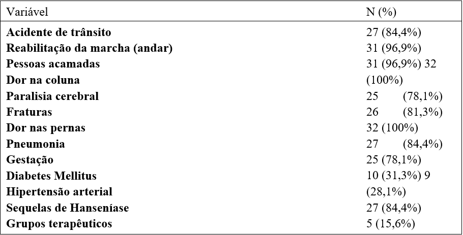 Ainda foi investigado sobre o conhecimento dos ACS sobre as situações nas quais a fisioterapia seria indicada e os resultados apontam que as situações que menos tem reconhecimento da atuação fisioterapêutica é os grupos terapêuticos (15,6%) e as doenças crônicas como a hipertensão arterial (28,1%) e a diabetes melittus (31,3%) (tabela 3)
