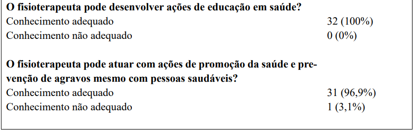 Entre os ACS entrevistados (90,6%) possuem um conhecimento adequado de que a fisioterapia na APS não se restringem a apenas pacientes acamados e (75%) acreditam que o fisioterapeuta pode atuar na atenção básica mesmo com falta de equipamentos podendo atuar também com educação em saúde como (100%) dos ACS afirmaram (tabela 2).