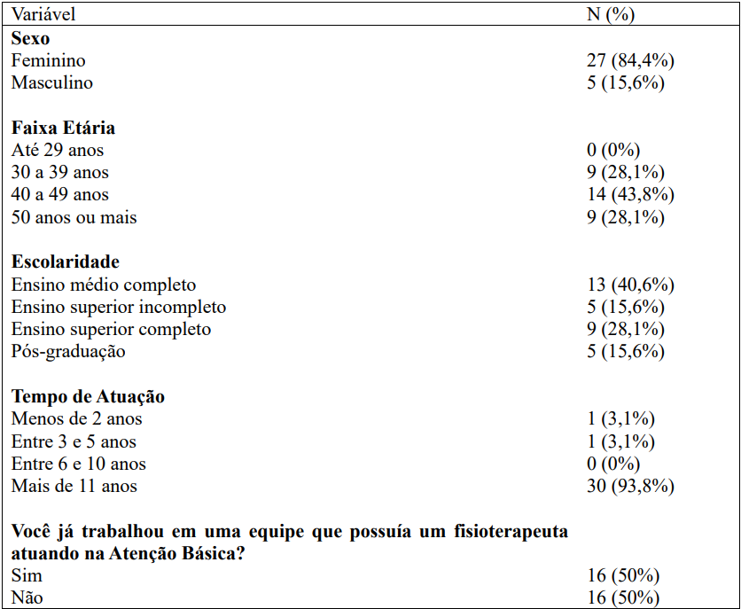 Em relação às características sociodemográficas observou-se alta predominância feminina (84,4%) e profissionais experientes com mais de 11 anos de atuação em serviço (93,8%), em relação a ESF (50%) relatou nunca ter trabalhado com a presença de um fisioterapeuta na equipe, o detalhamento das variáveis sociodemográficas referente aos ACS, estão descritas na tabela 1.