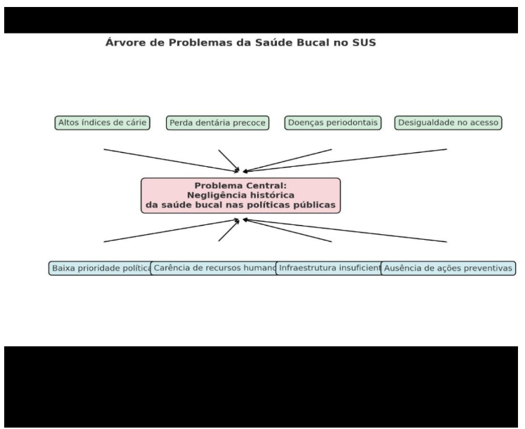A utilização da Árvore de Problemas como ferramenta de análise permite visualizar de forma clara a inter-relação entre as causas e os efeitos, evidenciando que a ausência de políticas estruturadas de saúde bucal não é apenas uma falha setorial, mas um fator que amplia desigualdades sociais e compromete o princípio da equidade do SUS. Essa leitura crítica reforça a relevância da criação da Política Nacional de Saúde Bucal e do Programa Brasil Sorridente como resposta para superar esse histórico de exclusão.