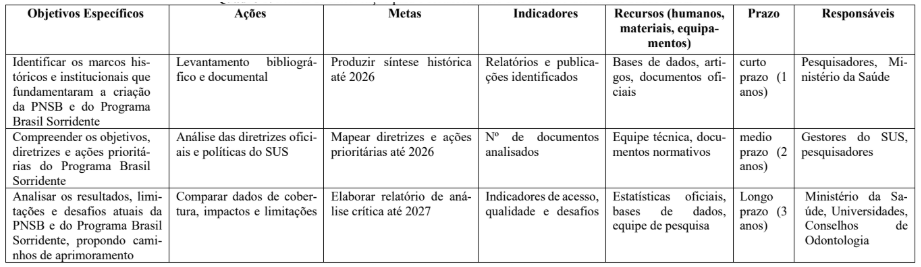 O quadro da matriz de intervenção sintetiza as estratégias propostas para o fortalecimento da Política Nacional de Saúde Bucal (PNSB) e do Programa Brasil Sorridente. Ele organiza de forma clara os objetivos, ações, metas, indicadores, recursos, prazos e responsáveis, possibilitando uma visão sistematizada das propostas e favorecendo o planejamento e o monitoramento das iniciativas. Além disso, destaca-se por alinhar os resultados esperados às necessidades de equidade, sustentabilidade e efetividade no SUS, contribuindo para o aprimoramento da gestão pública em saúde bucal.
