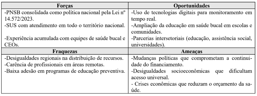 Nesse contexto, surgem oportunidades importantes de inovação e fortalecimento da PNSB. Dentre elas, destacam-se o uso de tecnologias da informação para monitoramento em tempo real dos indicadores de saúde bucal, a regionalização mais equitativa dos serviços, a capacitação contínua dos profissionais, além da promoção da educação em saúde com foco na prevenção. Tais estratégias podem reduzir desigualdades, melhorar a resolutividade dos atendimentos e garantir o acesso universal à saúde bucal de qualidade no SUS.