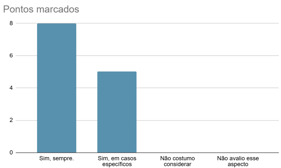 Conforme o gráfico 6, a maioria dos profissionais (61,5%) relatou considerar sempre os estímulos vestibulares parte fundamental de suas avaliações. Outros 38,5% afirmaram levar em conta apenas em situações específicas, enquanto nenhum participante relatou desconsiderar esse aspecto. Isso demonstra um consenso entre os profissionais sobre a relevância do sistema vestibular, reforçando a ideia de que sua análise é indispensável para uma compreensão integral das dificuldades motoras em crianças com TEA.