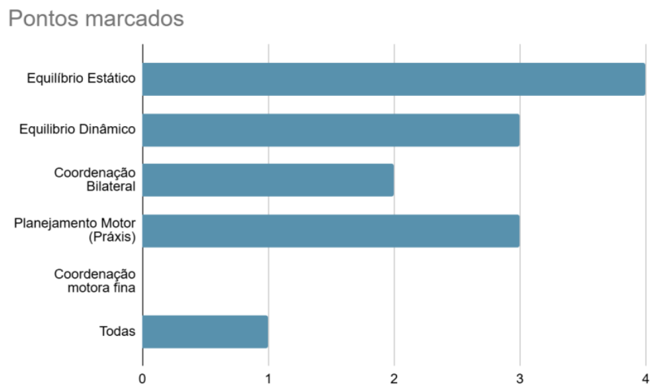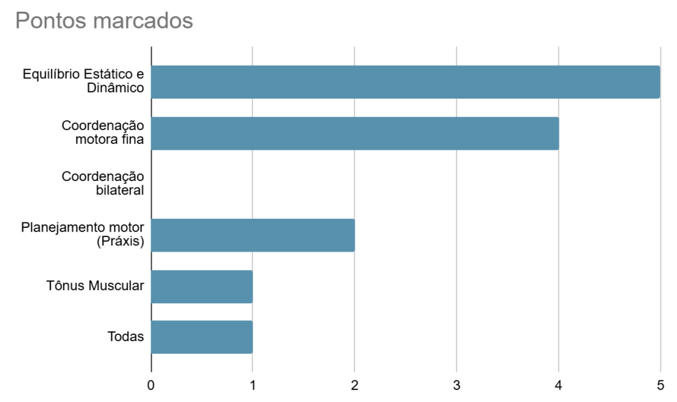 Os resultados indicam que os profissionais dão ênfase ao equilíbrio estático e dinâmico como ponto de partida nas intervenções, reconhecendo sua importância para a estabilidade corporal e a autonomia funcional. Essa prioridade reflete uma compreensão prática de que o controle postural é a base sobre a qual outras habilidades motoras, como a coordenação e a práxis, se desenvolvem de forma mais eficiente.