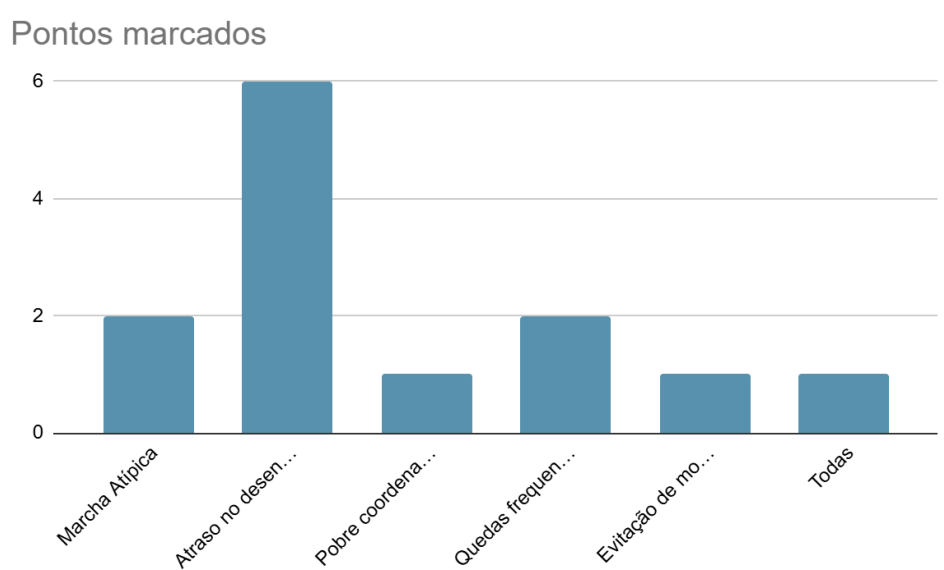 Observa-se com base nas respostas adquiridas, que o atraso no desenvolvimento motor global é o achado mais recorrente, o que indica que as dificuldades motoras são amplamente percebidas na prática clínica. A presença de marcha atípica e quedas frequentes reforça a ideia de que as disfunções vestibulares comprometem a coordenação e a estabilidade postural. Esses resultados destacam a importância de identificar precocemente os sinais motores para direcionar intervenções mais eficazes.