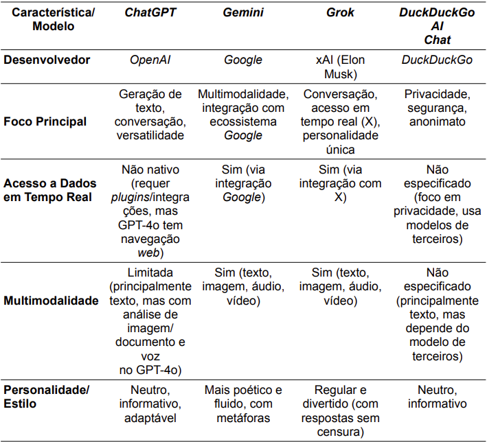Palavra Chave: Inteligência Artificial, Chatbot, ChatGPT, Gemini, Grok, DuckDuckGo AI Chat, Comparativo, Privacidade, Multimodalidade.