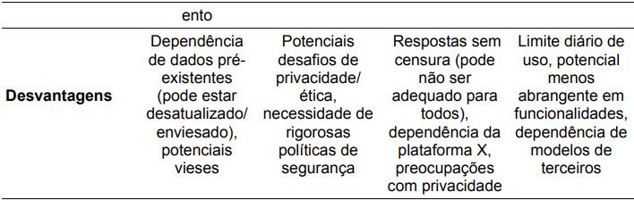 No entanto, as desvantagens podem incluir a natureza “sem censura” de suas respostas, que pode não ser adequada para todos os contextos ou para usuários que preferem interações mais formais e controladas. Além disso, a dependência da plataforma X para acesso a dados em tempo real pode ser uma limitação para usuários que não utilizam essa plataforma ou em cenários onde a conectividade com o X é restrita. Há também preocupações levantadas sobre a privacidade e o uso de dados do X para treinamento do Grok [22, 23].