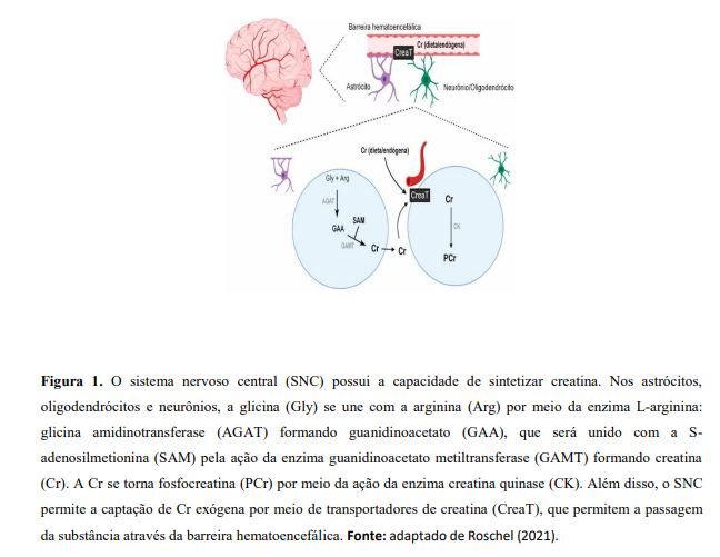 Ainda de acordo com a figura 1, além de possuir a capacidade de sintetizar creatina, o sistema nervoso central pode captar essa substância exógena por meio de transportadores de creatina (CreaT) presentes na barreira hematoencefálica, possibilitando com que o composto chegue ao sistema nervoso central, onde se apresenta disponível também na forma defosfocreatina (PCr) após sofrer ação da creatina quinase (CK) (McLeish; Kenyon, 2005), permitindo o aumento dos níveis de ATP através de seu mecanismo de ação.