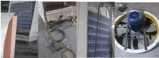 Para garantir a circulação adequada da água no painel de colmeia de PVC, foi incorporada uma bomba de água com uma velocidade de deslocamento de 2 m/s. A bomba desempenha um papel crucial no processo de resfriamento, pois proporciona a umidade necessária para a evaporação, que é fundamental para o funcionamento eficiente do sistema, a velocidade do ar no sistema da colmeia polimérica era de aproximadamente 2,5 m/s, essa velocidade foi utilizada para se evitar o arraste de água.