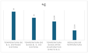 Durante o experimento, o sistema foi operado continuamente, e as temperaturas do ar de entrada e saída foram monitoradas de forma sistemática. A saída de ar resfriado foi registrada e alcançou uma temperatura de 30ºC, enquanto a temperatura de bulbo úmido do ar de saída foi medida em 24,4ºC. Esses valores indicam uma eficiência significativa do sistema de IEC em resfriar o ar, demonstrando sua capacidade de operar efetivamente sob condições adversas.