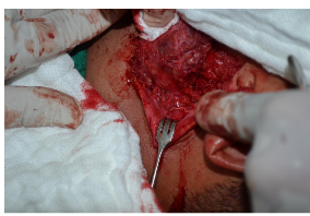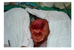 No dia 11 de junho, realizou-se a abordagem cirúrgica do mesmo, as incisões realizadas foram as pré auricular (figura 3) e retroauricular (figura 4) que se estenderam para um acesso de Blair (figura 3 e 4) a nível dérmico e subcutâneo, seguido pela realização de um ponto de tração auricular no lóbulo para melhor visualização no momento cirúrgico, após o devido descolamento dos tecidos a lesão foi identificada (figura 5) e iniciou-se a apreensão da lesão (figura 6) e o procedimento de parotidectomia parcial (figura 7), com remoção total da lesão que media aproximadamente 15cm de comprimento por 8cm de largura, e aproximadamente 7 de espessura (figura 8) e envolvia o lobo superior da glândula parótida.
