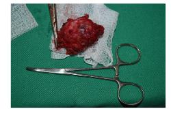 Figura 7. Remoção total da lesão por meio do procedimento de parotidectomia parcial, preservando tecido sadio da glândula parótida.
