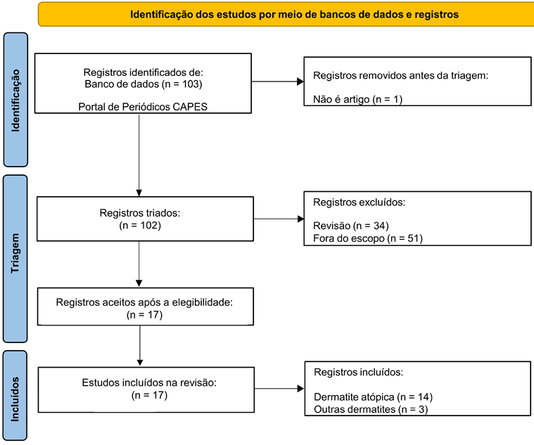 Na plataforma, foi utilizado o filtro para incluir apenas artigos científicos revisados por pares, resultando em um total de 103 manuscritos. No entanto, verificou-se que um desses manuscritos não se tratava de um artigo científico (n = 1). Dos 102 artigos restantes, 85 foram excluídos com base em critérios predefinidos. Esses critérios incluíram a exclusão de artigos categorizados como revisões de literatura (n = 34) e/ou que não abordavam o tema em questão, ou que apenas mencionavam os descritores (“dermatitis” AND “nutraceutical”) ao longo do texto (n = 51). Assim, um total de 17 artigos foi selecionado para compor o manuscrito. Os critérios de inclusão focaram em artigos que avaliavam a eficácia de nutracêuticos no tratamento da dermatite. Os artigos selecionados foram categorizados em duas categorias: dermatite atópica (n = 14) e outros tipos de dermatite (n = 3). Para fins de classificação, os artigos que utilizam o termo ‘eczema’ de forma genérica, mas que abordam explicitamente a fisiopatologia da dermatite atópica em seus contextos clínicos ou mecanismos de ação, foram incluídos na categoria de DA (Figura 1).
