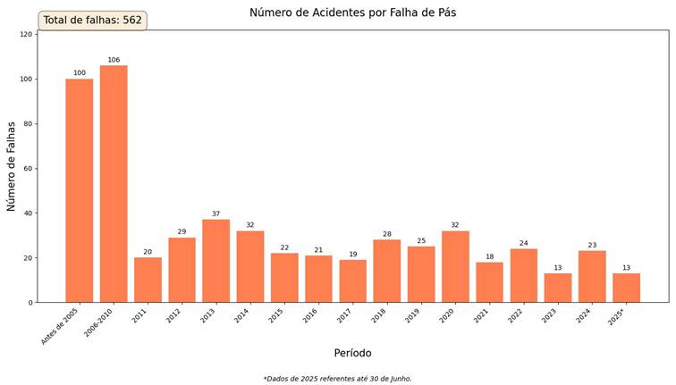 Os acidentes com pás podem ser categorizados em falhas catastróficas, que ocorrem de forma súbita, e em processos de degradação, que comprometem a segurança e a eficiência a longo prazo.