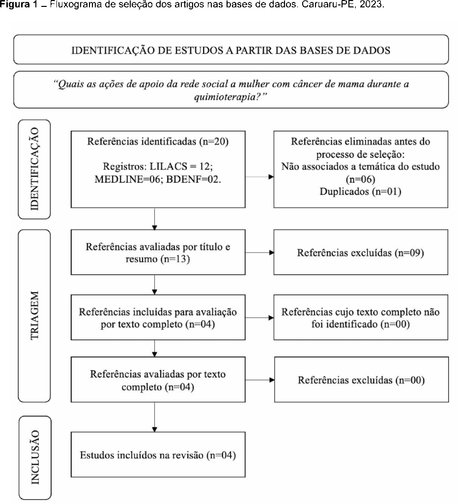 Na primeira etapa buscou-se orientação da busca através da elaboração da pergunta norteadora com base na estratégia PICO, onde: P – mulheres com câncer de mama; I – Quimioterapia; C- não existe; O – ações de apoio da rede social. Através da qual foi desenvolvida a seguinte questão orientadora da revisão: