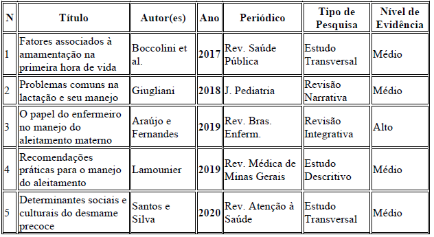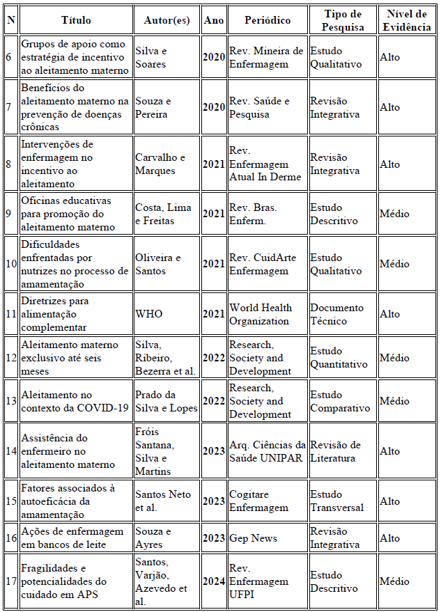 ARAÚJO, D. S.; FERNANDES, M. F. Papel do enfermeiro no manejo do aleitamento materno: uma revisão integrativa. Revista Brasileira de Enfermagem, Brasília, v. 72, n. 5, p. 1120-1128, 2019. DOI: https://doi.org/10.1590/0034-7167-2018-0095. Acesso em: 23 set. 2025.