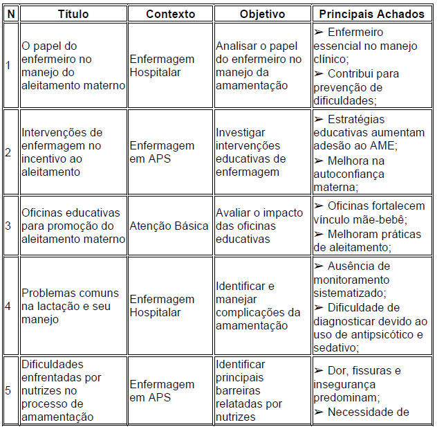 O Quadro 2 apresenta a síntese dos estudos incluídos na revisão, destacando o contexto de realização, os objetivos e os principais achados identificados em cada pesquisa. Essa sistematização permite visualizar de forma comparativa as abordagens adotadas pelos autores, evidenciando convergências quanto à importância do papel do enfermeiro no manejo do aleitamento materno, bem como as principais dificuldades enfrentadas pelas nutrizes e as estratégias educativas utilizadas para promover o aleitamento exclusivo. Observa-se que, em diferentes contextos, os resultados reforçam a necessidade de ações sistematizadas, acompanhamento contínuo e apoio multiprofissional para o êxito da amamentação.