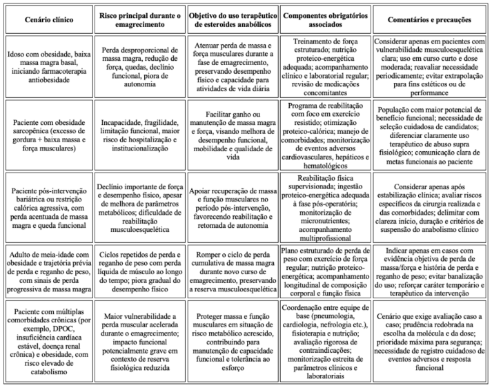 O Quadro 2 organiza, de forma prática, alguns cenários clínicos nos quais o uso terapêutico de esteroides anabólicos poderia ser considerado como adjuvante durante o emagrecimento, considerando o contexto de maior vulnerabilidade musculoesquelética.