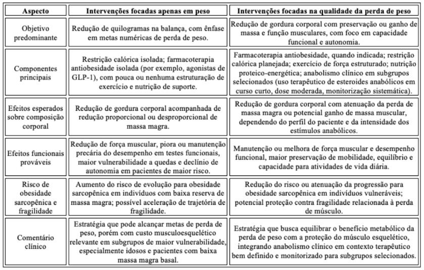 Quadro 1. Modelo conceitual que contrasta intervenções de perda de peso focadas apenas em quilogramas perdidos com abordagens centradas na qualidade da perda de peso. No primeiro caminho, a restrição calórica e/ou a farmacoterapia antiobesidade utilizadas de forma isolada podem reduzir gordura, mas também prejudicialmente reduzem massa e função musculares, favorecendo a evolução para obesidade sarcopênica em indivíduos vulneráveis. No segundo, a combinação de estratégias, incluindo exercício de força, nutrição proteico-energética e, em subgrupos selecionados, anabolismo clínico em regime terapêutico, busca reduzir gordura preservando massa e função musculares, com foco na manutenção da autonomia e qualidade de vida.