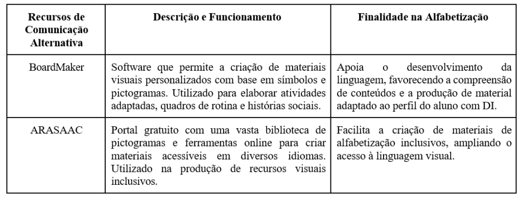 Tabela 1. Recursos de Comunicação Alternativa e Ampliada utilizados na alfabetização de alunos com Deficiência Intelectual