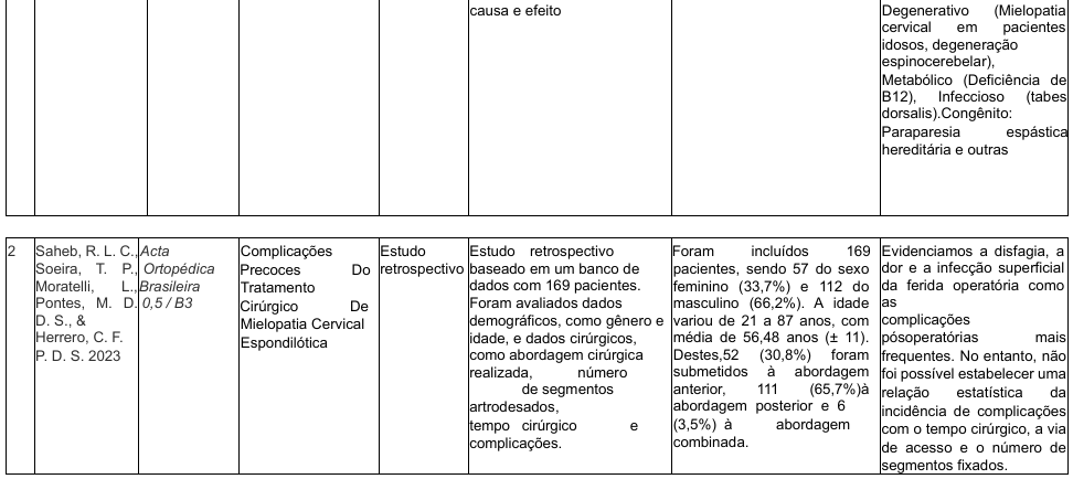- SAHEB, R. L. C., SOEIRA, T. P., MORATELLI, L., PONTES, M. D. D. S., & HERRERO, C. F. P. D. S. Complicações Precoces Do Tratamento Cirúrgico De Mielopatia Cervical Espondilótica. Acta Ortopédica Brasileira, v.31, p.e260397,2023.