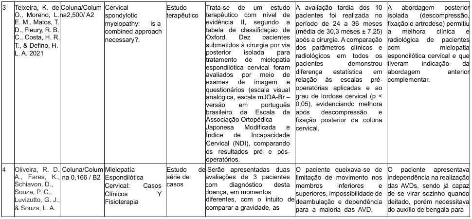 - TEIXEIRA,K.O.; MORENO, L.E.M.; MATOS, T.D.; FLEURY, R.B.C.; COSTA, H.R.T.; DEFINO, H.L.A. Mielopatia cervical espondilótica: a abordagem combinada é necessária? Coluna/Columna, v. 20, n. 2, p. 78-83, 2021.
