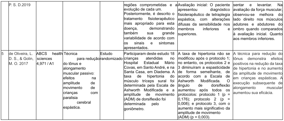 - SEGURA,D.C.A.; CRESPÃO, D. L.; DAROLT, M.; BELEDEL, S. A.; PICCIN, A. S.; PICININI, J. A. S. Análise do tratamento da espasticidade através da fisioterapia e da farmacologia – um estudo de caso. Arq. Ciênc. Saúde Unipar, Umuarama, v. 11, n. 3, p. 217-224, 2017.