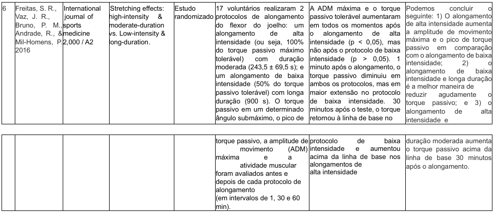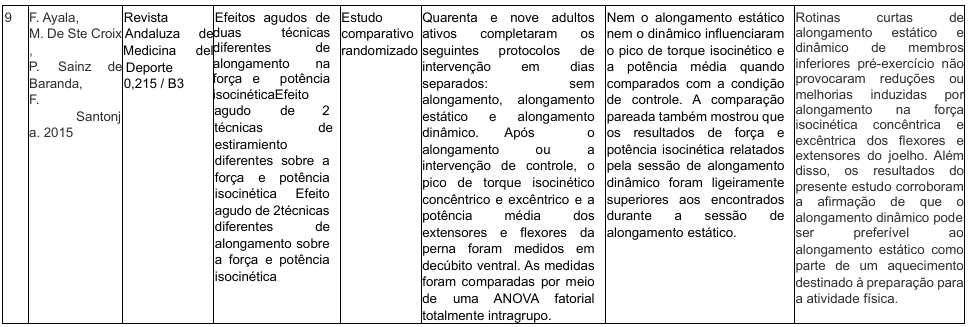 - ESPINOZA, G.A; et al. Efeito agudo do alongamento estático e dinâmico sobre o desempenho e percepção do esforço no exercício de contra-resistência. MH Salud, Heredia, v. 18, n. 1, p. 1-18, 2021.
