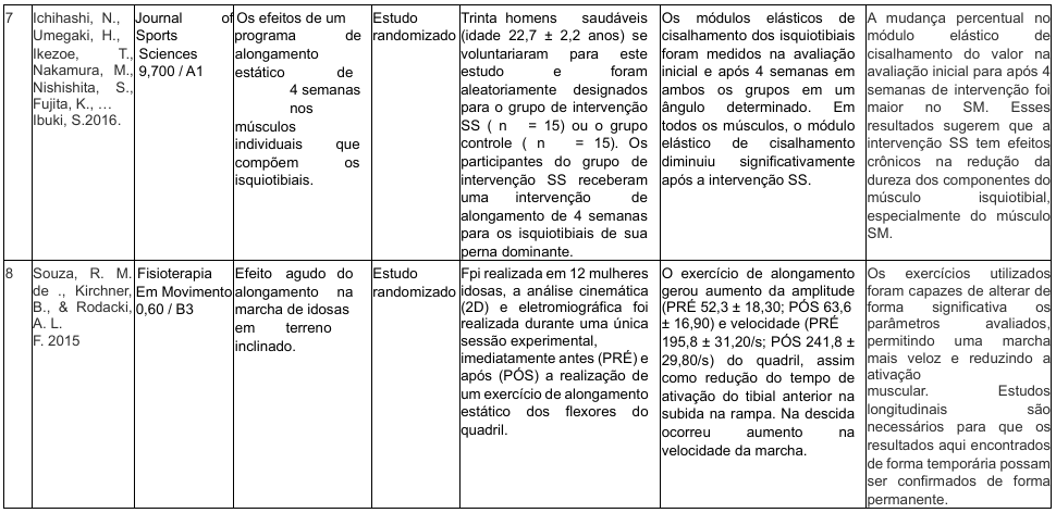 - SOUZA, R. M. DE ., KIRCHNER, B., & RODACKI, A. L. F.. Efeito agudo do alongamento na marcha de idosas em terreno inclinado. Fisioterapia Em Movimento, v.28, n. 2, p. 383–394, 2015.
