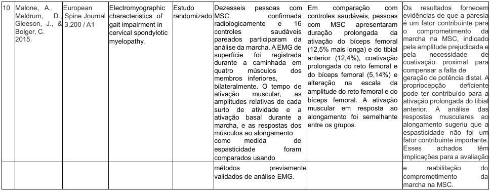 - MALONE, A., MELDRUM, D., GLEESON, J., & BOLGER, C. Electromyographic Characteristics Of Gait Impairment In Cervical Spondylotic Myelopathy. European Spine Journal, v. 22, p. 2538-2544, 2015.