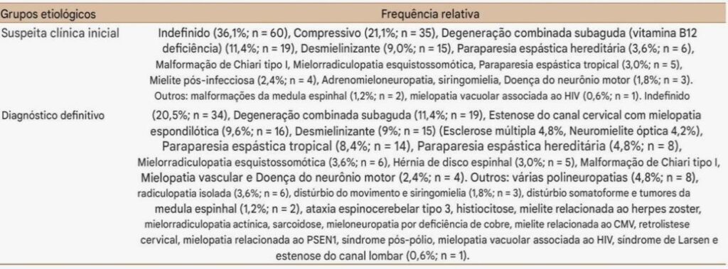 Montenegro et al.(30) relatam que a mielopatia está classificada dentro da síndrome de NMS com paraplegia ou quadriplegia. Paraplegia estabelece, principalmente, lesões na medula, porque seriam necessárias lesões bilaterais no cérebro ou grandes lesões no tronco encefálico para manifestações bilaterais. O mais comum é que lesões na medula provoquem mudanças sensitivas e motoras simultaneamente. A degeneração combinada da medula é o quadro resultante da deficiência de vitamina B12, em que ocorre acometimento isolado da sensibilidade tátil-proprioceptiva. Assim, a etiologia crônica: degenerativa (mielopatia cervical em pacientes idosos, degeneração espinocerebelar), metabólica (deficiência de B12), infecciosa (tabes dorsalis).