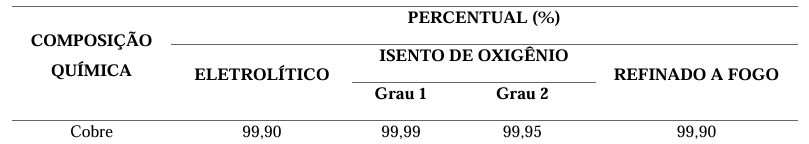 A NBR 14733:2001 especifica os requisitos mínimos para o vergalhão de cobre utilizado em condutores elétricos. De acordo com essa norma, o cobre deve apresentar pureza mínima de 99,90%, seja ele refinado a fogo, eletrolítico ou isento de oxigênio.