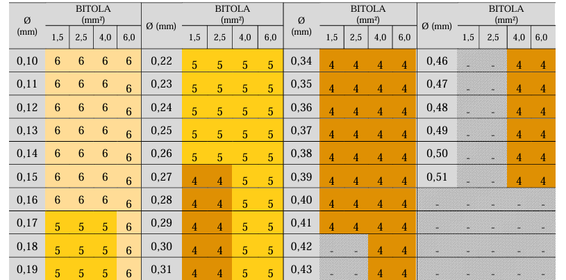 - Para cabos de 1,5 mm², 2,5 mm² e 4,0 mm² da classe seis, os fios individuais alcançam até 0,16 mm de diâmetro; para cabos de 6,0 mm², o diâmetro chega a 0,21 mm.