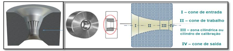 Figura 5: Fieira, corte transversal e suas zonas.