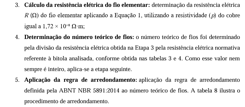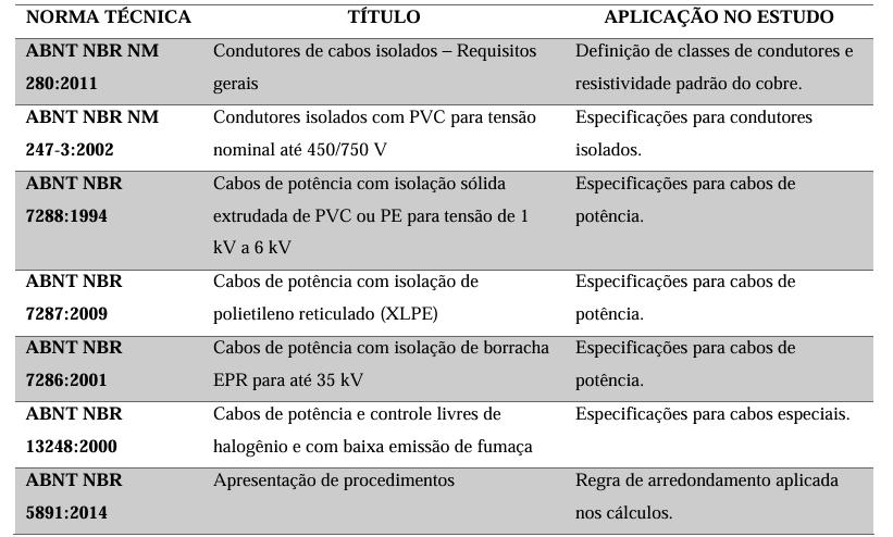 - Normas técnicas: as normas selecionadas (Tabela 8) constituíram a base documental do estudo, sendo detalhadas no Referencial Teórico (Seção 2.3). Elas definem os requisitos gerais, as classes de condutores e as especificações de isolamento que serviram como instrumentos de coleta de dados e parâmetros de verificação para os cálculos de engenharia.