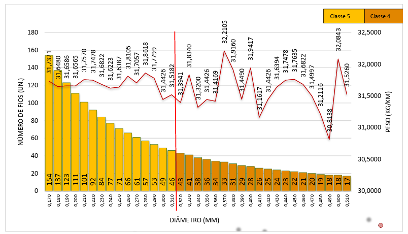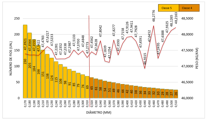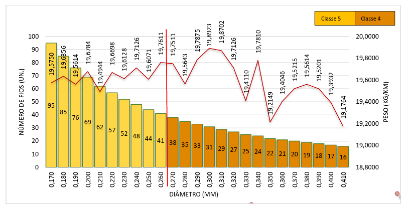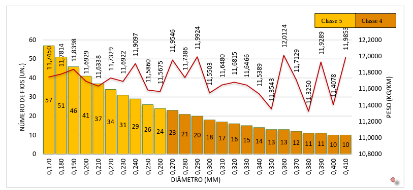 No Gráfico 3, as barras representam o número de fios, arredondados, referenciados pelo eixo das ordenadas à esquerda. Os pontos em vermelho indicam a massa teórica total do cabo, referenciada pelo eixo das ordenadas à direita. Ao longo do eixo das abscissas, apresenta-se a variação de diâmetro respeitando as classes de encordoamento, representadas pelas cores: tom mais claro indica a classe 5 e tom mais escuro, a classe 4.