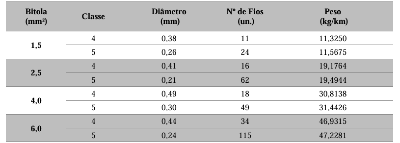 - Para a classe cinco, os cabos de 1,5 mm² e 2,5 mm² podem chegar a 0,26 mm, e os de 4,0 mm² e 6,0 mm² até 0,31 mm.
