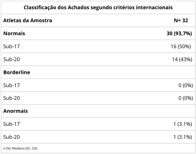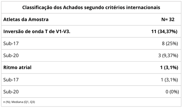 A partir da análise dos dados, conclui-se que 30 exames eletrocardiográficos constavam alterações esperadas para o coração do atleta (93%), considerados normais e 2 apresentavam achados anormais (6%), um em cada categoria, pela presença de inversões em onda T, sendo um em DIII e AvF e outro em DIII e AvL; ambos foram submetidos à propedêutica complementar com ecocardiograma transtorácico, o qual descartou alterações estruturais potencialmente comprometedora. Nenhum atleta apresentou alterações “borderline” (Tabela 4).