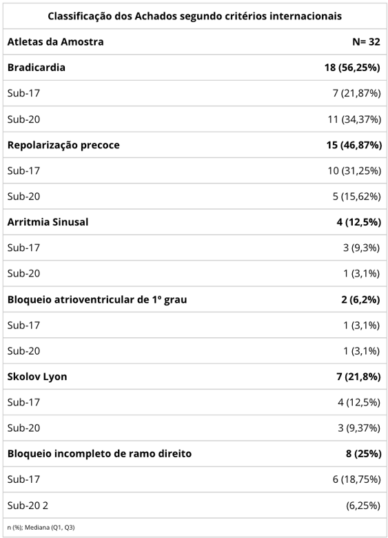A utilização do ECG em repouso como parte da avaliação pré-participação é fundamental para a triagem e prevenção de desfechos fatais. Os achados presentes nos eletrocardiogramas dos atletas são compatíveis com os descritos na literatura internacional. O debate dos achados mais frequentes é fundamental para aumentar a eficácia das análises.