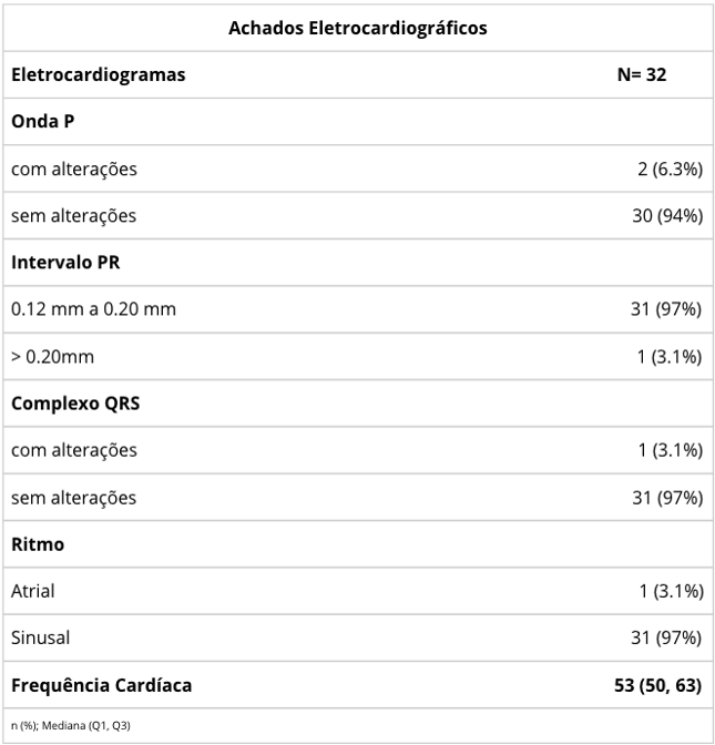 Tendo em vista os achados eletrocardiográficos dos atletas participantes do estudos, eles foram descritos quanto a alterações nas seguintes variáveis: onda P, intervalo PR, complexo QRS, eixo cardíaco, ritmo cardíaco, frequência cardíaca, critérios de sobrecarga ventricular esquerda (SVE) e repolarização precoce, presença de inversão de onda T e de hemibloqueio.