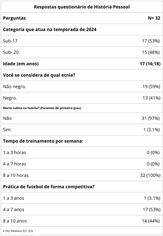 Neste estudo observacional transversal todos os participantes são atletas de um clube de futebol de elite de Belo Horizonte, atuantes nas categorias de base Sub-17 e Sub-20, com idades variando entre 16 e 18 anos (Tabela 1). Foram excluídos atletas que tinham doenças cardiovasculares conhecidas, aqueles que não eram de nacionalidade brasileira, ou os que não assinaram o formulário sobre o perfil epidemiológico individual.