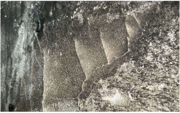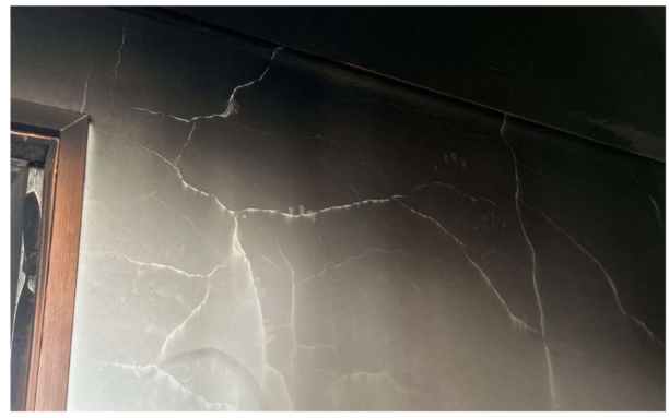 Observou-se, nas imediações da área adjacente à geladeira, um significativo desplacamento de revestimentos cerâmicos e de argamassa. Embora fenômenos similares de desplacamento tenham sido identificados em outros compartimentos, sua incidência e severidade foram notavelmente mais pronunciadas na área próxima ao foco do incêndio. Adicionalmente, um aspecto crítico a ser considerado refere-se à presença de fissuras localizadas nas proximidades da área de origem presumida do incêndio (na porção posterior à geladeira). Embora não tenha sido possível confirmar se as fissuras já estavam presentes antes do incêndio, notou-se que as mesmas se estendem transversalmente pelo elemento construtivo.