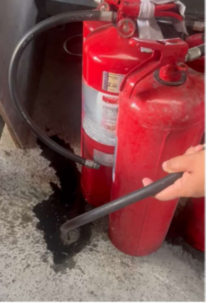 Imagem 06: Teste realizado nos extintores do prédio, destaque para líquido preto saindo do extintor de água.