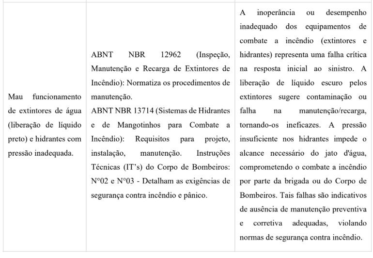 Em síntese, o incidente demonstra um cenário de vulnerabilidades múltiplas, onde deficiências elétricas, falhas nos sistemas de segurança e patologias estruturais se somaram. A intersecção desses achados revela, portanto, um cenário de múltiplas vulnerabilidades, desde o projeto e a execução das instalações elétricas até a negligência na manutenção dos sistemas de segurança. Cada falha, por si só, representa um risco, mas a combinação delas potencializou a ocorrência e a gravidade do incêndio, ressaltando a importância de uma abordagem integrada e rigorosa na conformidade normativa e na manutenção predial para garantir a segurança das edificações e seus ocupantes.