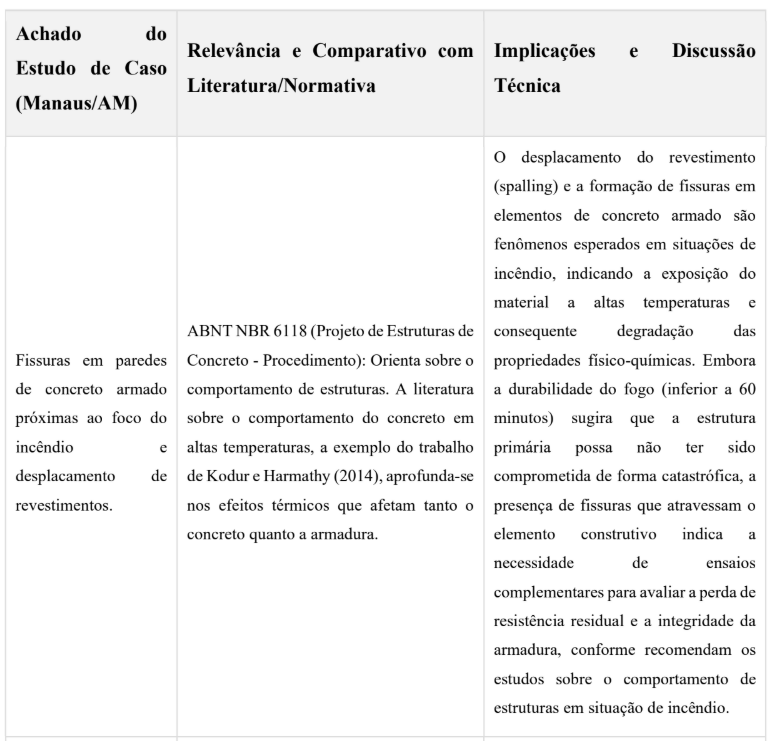 A análise do incêndio ocorrido em Manaus revelou um complexo conjunto de falhas interligadas que contribuíram decisivamente para a sua deflagração e propagação. Identificou se a cozinha como o foco inicial, com forte indicação de origem elétrica devido a falhas em tomadas e a disjuntores que não desarmaram, evidenciando graves não conformidades com a ABNT NBR 5410 e a ausência de projetos elétricos, o que aponta para vícios de projeto e execução. Paralelamente, os sistemas de combate a incêndio do condomínio falharam criticamente, com extintores ineficazes (liberando líquido anômalo) e hidrantes sem pressão adequada, indicando negligência na manutenção e desrespeito às normas da ABNT NBR 12962 e 13716. Em relação à estrutura, observaram-se fissuras em paredes de concreto armado e o desplacamento de revestimentos – fenômenos esperados em situação de incêndio –, embora a duração estimada do fogo sugira que a estrutura primária possa não ter sido totalmente comprometida. Contudo, a impossibilidade de determinar se as fissuras eram preexistentes sublinha a importância de históricos de manutenção. Por segurança, a recomendação de ensaios específicos é crucial para uma avaliação conclusiva da capacidade residual da estrutura.