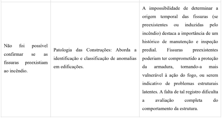 Foram observadas fissuras próximas à área de origem do incêndio (atrás da geladeira), tanto no lado interno do apartamento quanto no corredor do pavimento, atravessando o elemento construtivo. A natureza dessas fissuras (ativas ou passivas) não pôde ser determinada sem ensaios complementares.
