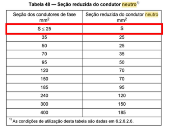 Figura 08: Tabela 48 da norma da ABNT NBR 5410, destaque para a obrigatoriedade de manter a seção do condutor neutro sem redução, até 25mm².